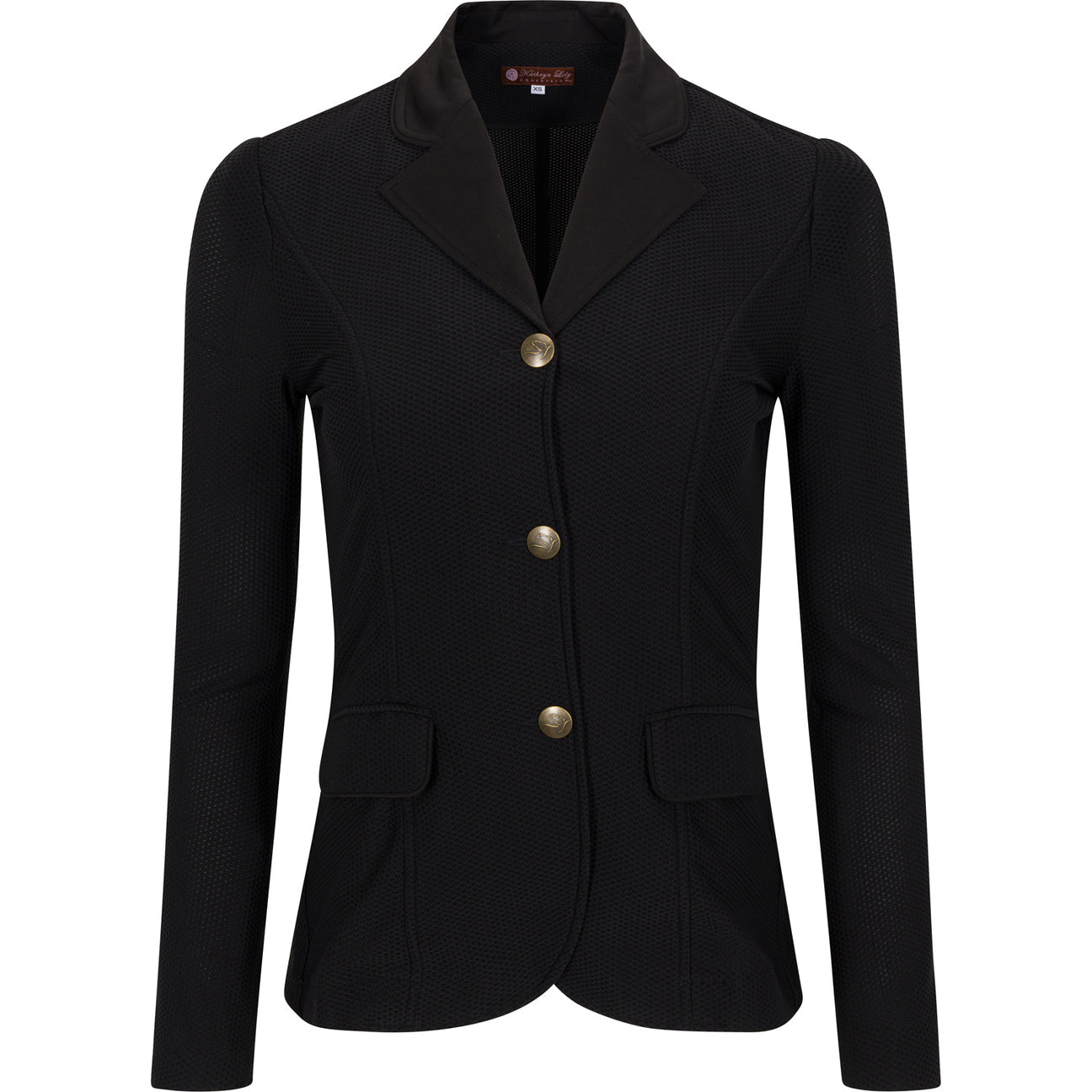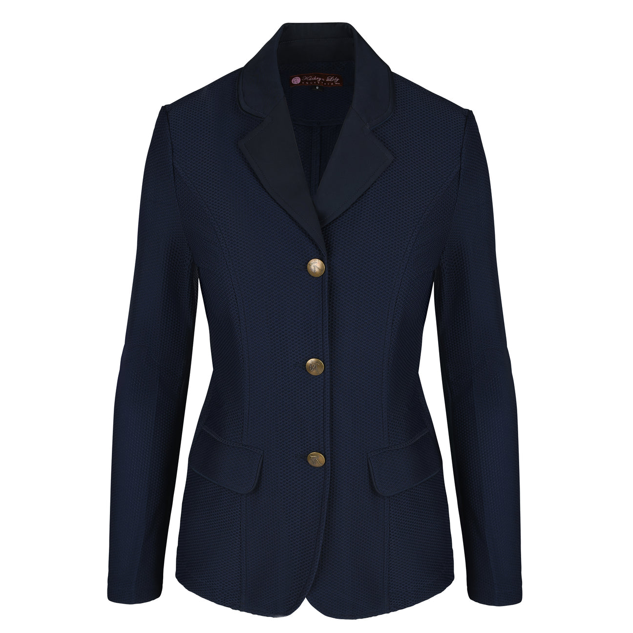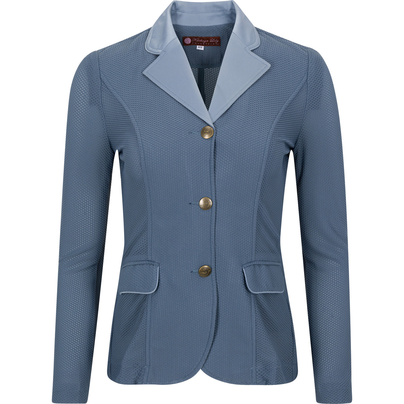 Jacket features custom horse head logo buttons, hidden inner